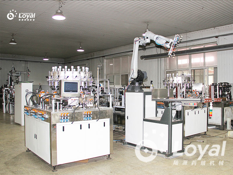 西林瓶生產(chǎn)線包括:自動(dòng)上管、自動(dòng)成型、經(jīng)機(jī)械手轉(zhuǎn)換至前端檢測(cè)線(也叫生產(chǎn)管控)、檢測(cè)線檢測(cè)的項(xiàng)目:1、瓶口內(nèi)外徑 2、瓶身長(zhǎng)短 3、瓶身外徑 4、瓶口邊厚 5、瓶底內(nèi)凹尺寸檢測(cè);經(jīng)檢測(cè)后的合格品再用機(jī)械手夾盤(pán)轉(zhuǎn)換至退火爐網(wǎng)帶上,經(jīng)高溫減除應(yīng)力后再降溫,通過(guò)氣動(dòng)吸盤(pán)將回火后的小瓶轉(zhuǎn)換至后端檢測(cè)線,后端檢測(cè)(也是重檢也叫終檢),經(jīng)后端拍照檢測(cè)項(xiàng)目